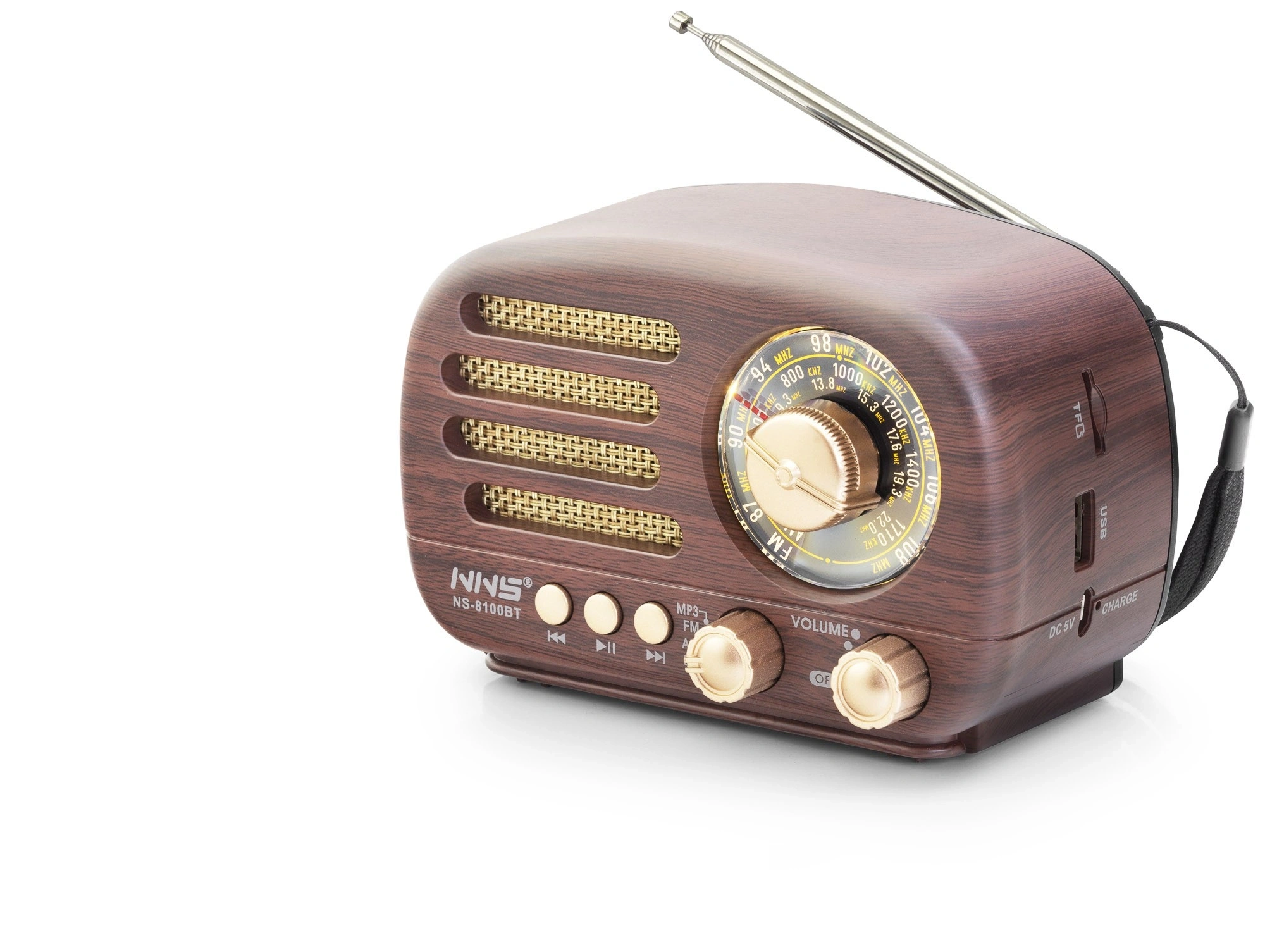 NS8100BT, Klasik Radyo Estetiğini Kompakt Bir Formda Sunan, 14.3 Cm Genişliğinde Taşınabilir Bir Nostaljik Ses Sistemidir. Ahşap Dokulu Zarif Kasası Ve Dairesel Frekans Göstergesiyle Retro Bir Şıklık Sunarken, Modern Bluetooth Bağlantısı Sayesinde Sevdiğiniz Müzikleri Her An Yanınızda Taşımanıza İmkan Tanır.