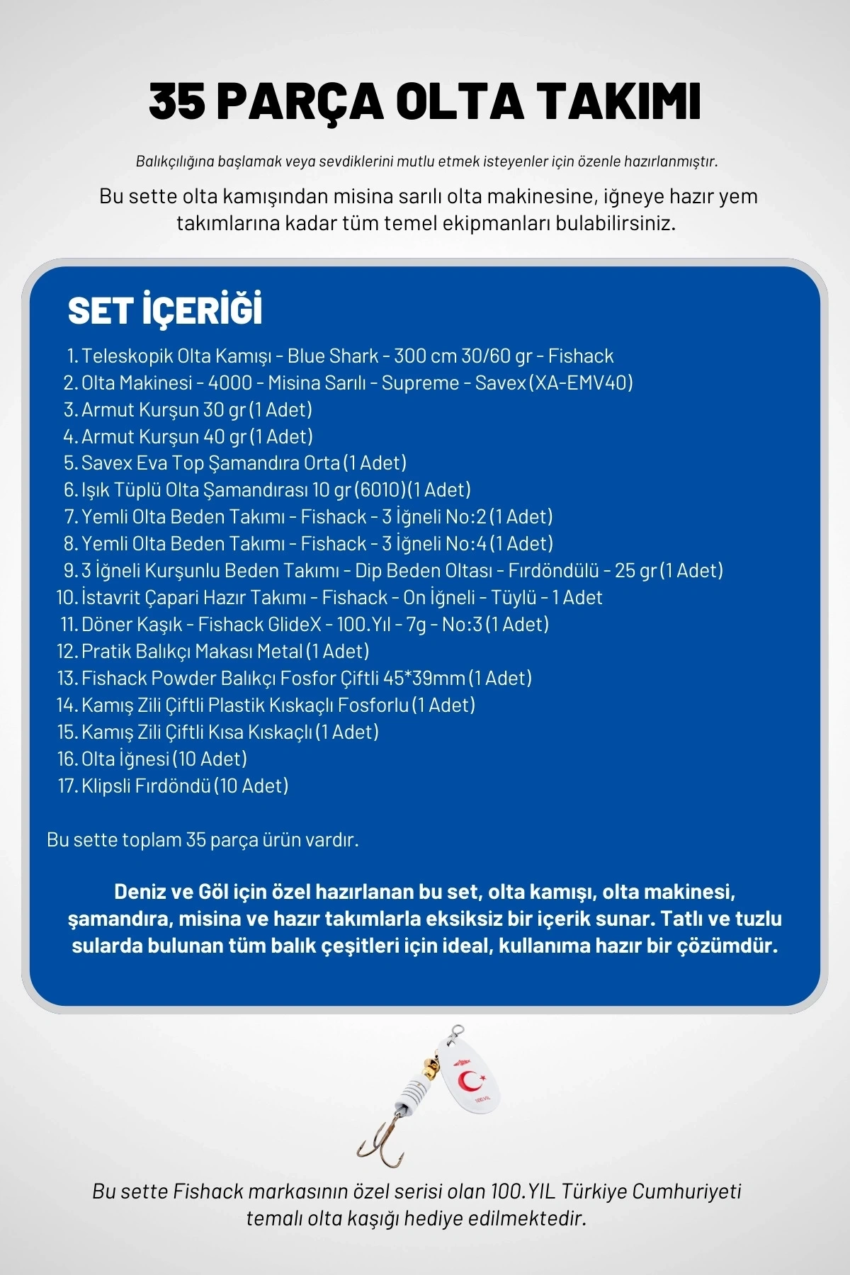 Deniz ve göl için özel hazırlanan bu 35 parçalık olta seti; olta kamışı, olta makinesi, şamandıra, misina ve hazır takımlarla eksiksiz bir içerik sunar. Tatlı ve tuzlu sularda bulunan pek çok balık türü için ideal, kullanıma hazır bir çözümdür.