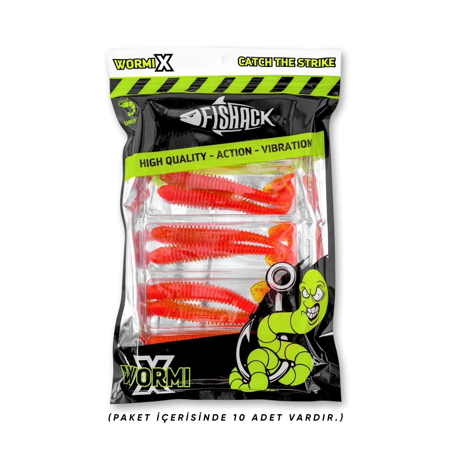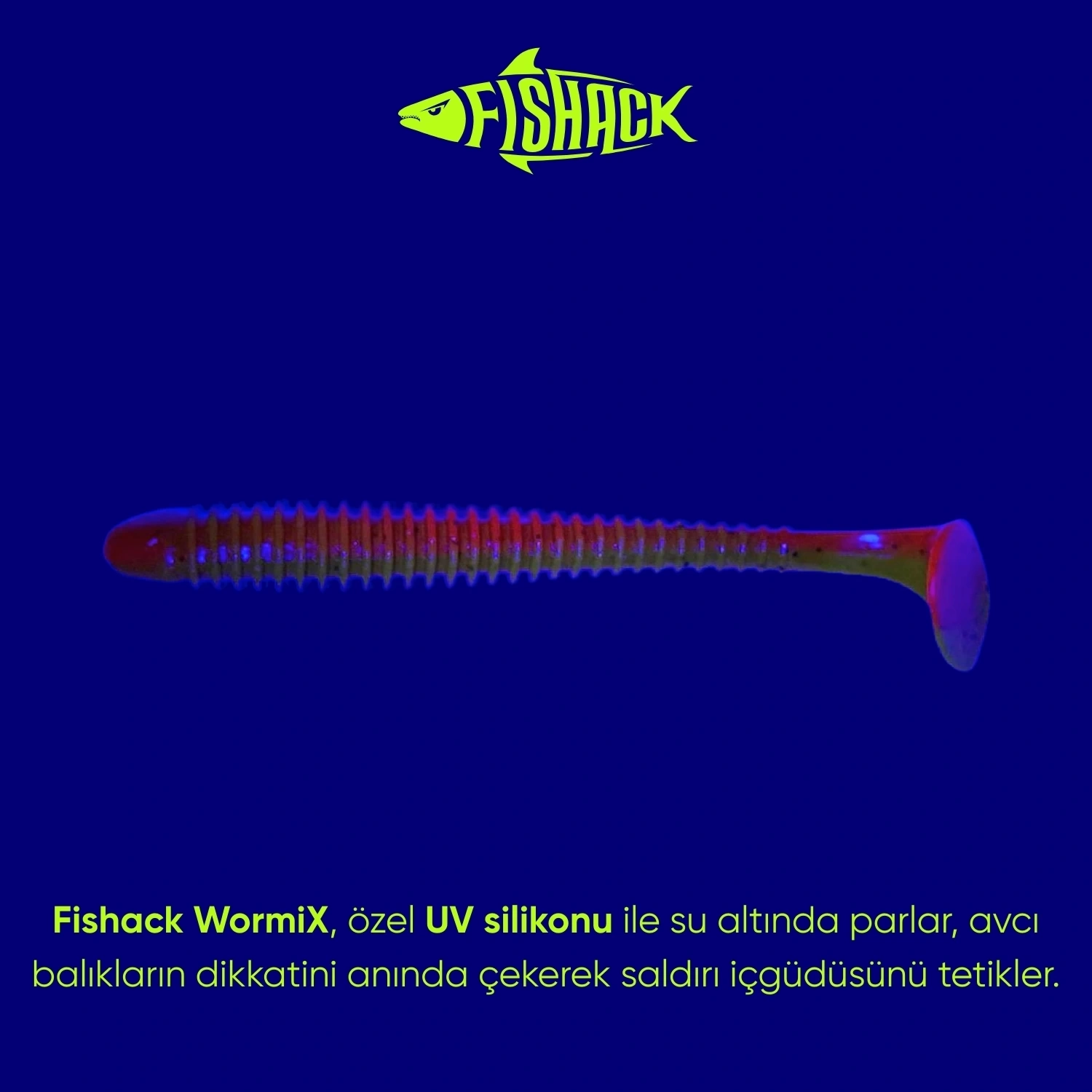 - Fishack silikon yemlerinde kullanılan özel UV aktif hammadde, düşük ışıkta dahi maksimum görünürlük sağlar. UV ışığını algılayabilen avcı balıkların dikkatini çeker ve saldırı refleksini tetikler. Böylece daha etkili ve verimli bir av deneyimi sunar.